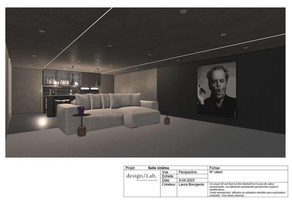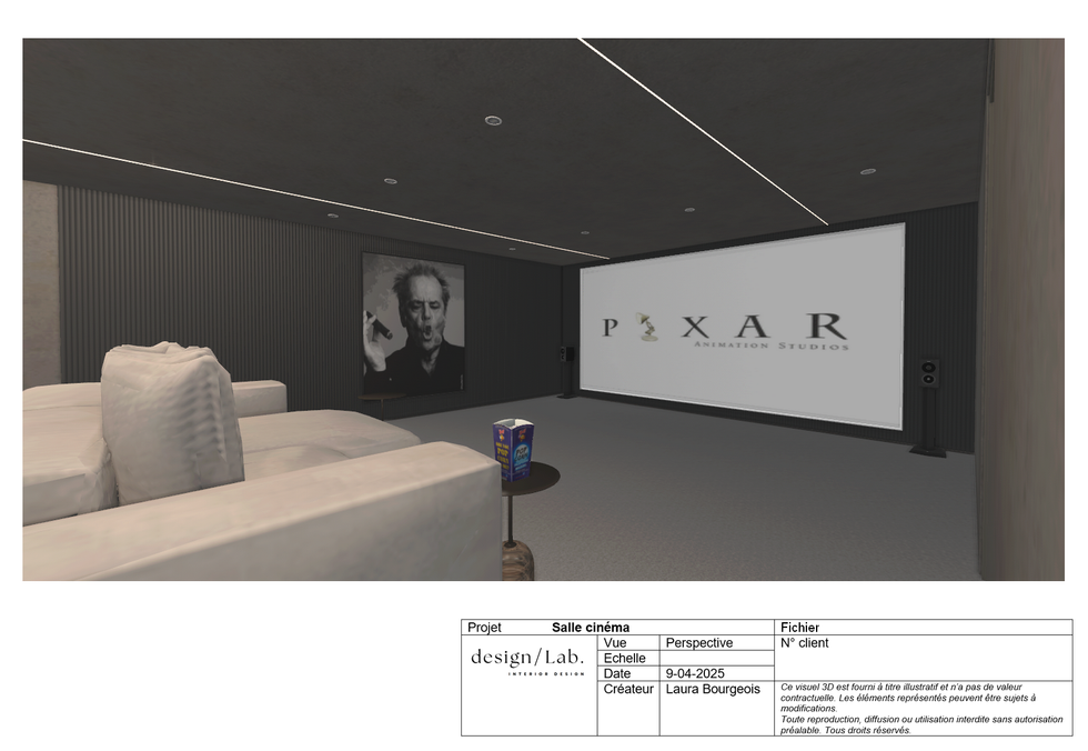 La zone cinéma est également renforcée par des panneaux acoustiques intégrés, pensés pour optimiser l’ambiance sonore tout en structurant l’espace.